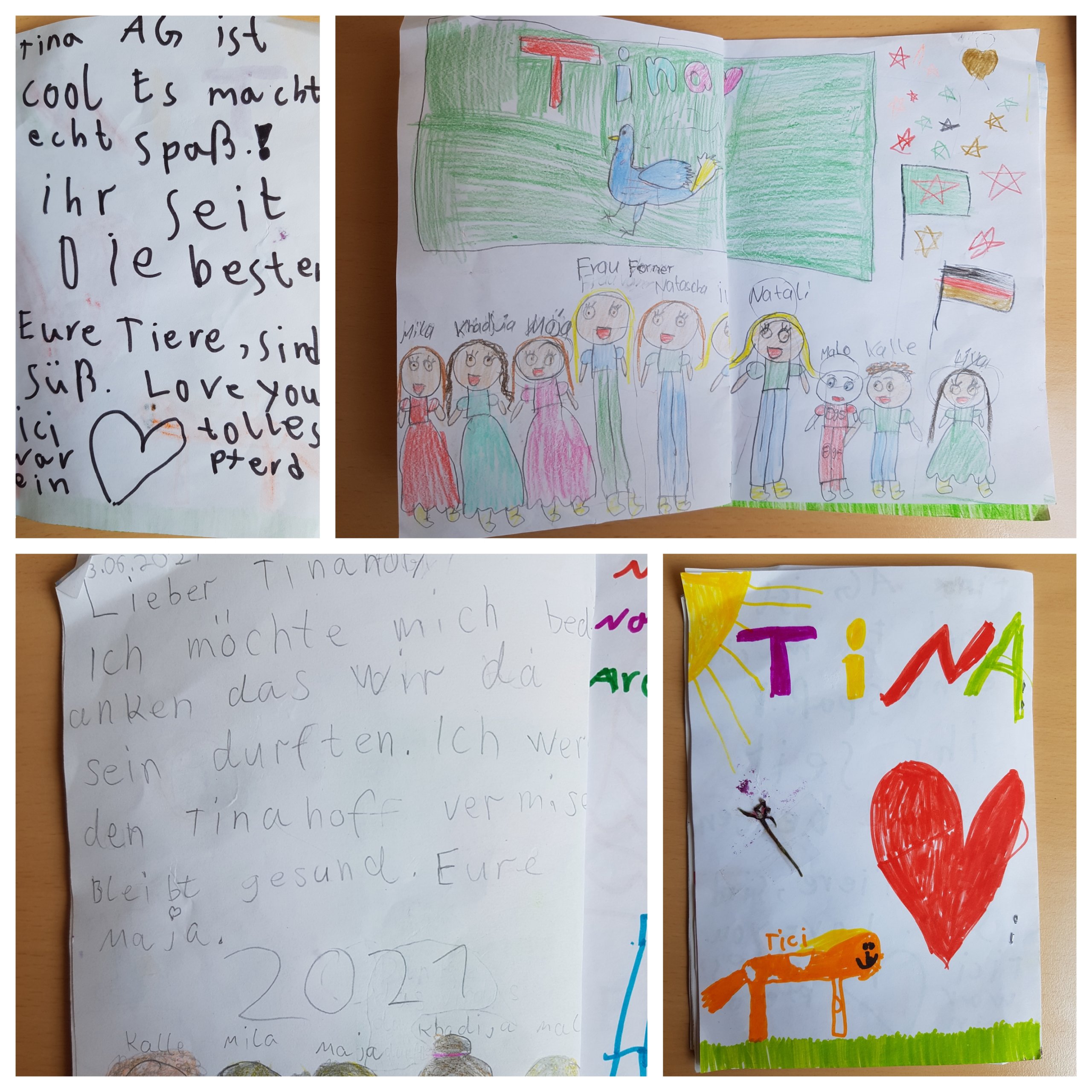 Gestern fand die vorerst letzte AG auf unserem Hof mit der OGS Fuldaerstraße statt. Die Kinder durften sich wünschen, was sie an ihrem letzten Tag machen, und raus kam eine bunte Mischung aus Froschbabys untersuchen, Katzen füttern, Himbeeren ernten, Ziegen kraulen und Heu auffüllen. Als Abschiedsgeschenk erhielten alle teilnehmenden Schüler*innen eine Präsenttasche mit Heft, veggie-Süßigkeiten, Sticker und einer Collage der Bilder, die hier mit ihnen entstanden sind. Und die Kinder wiederum waren so süß und bastelten uns ein Heftchen!