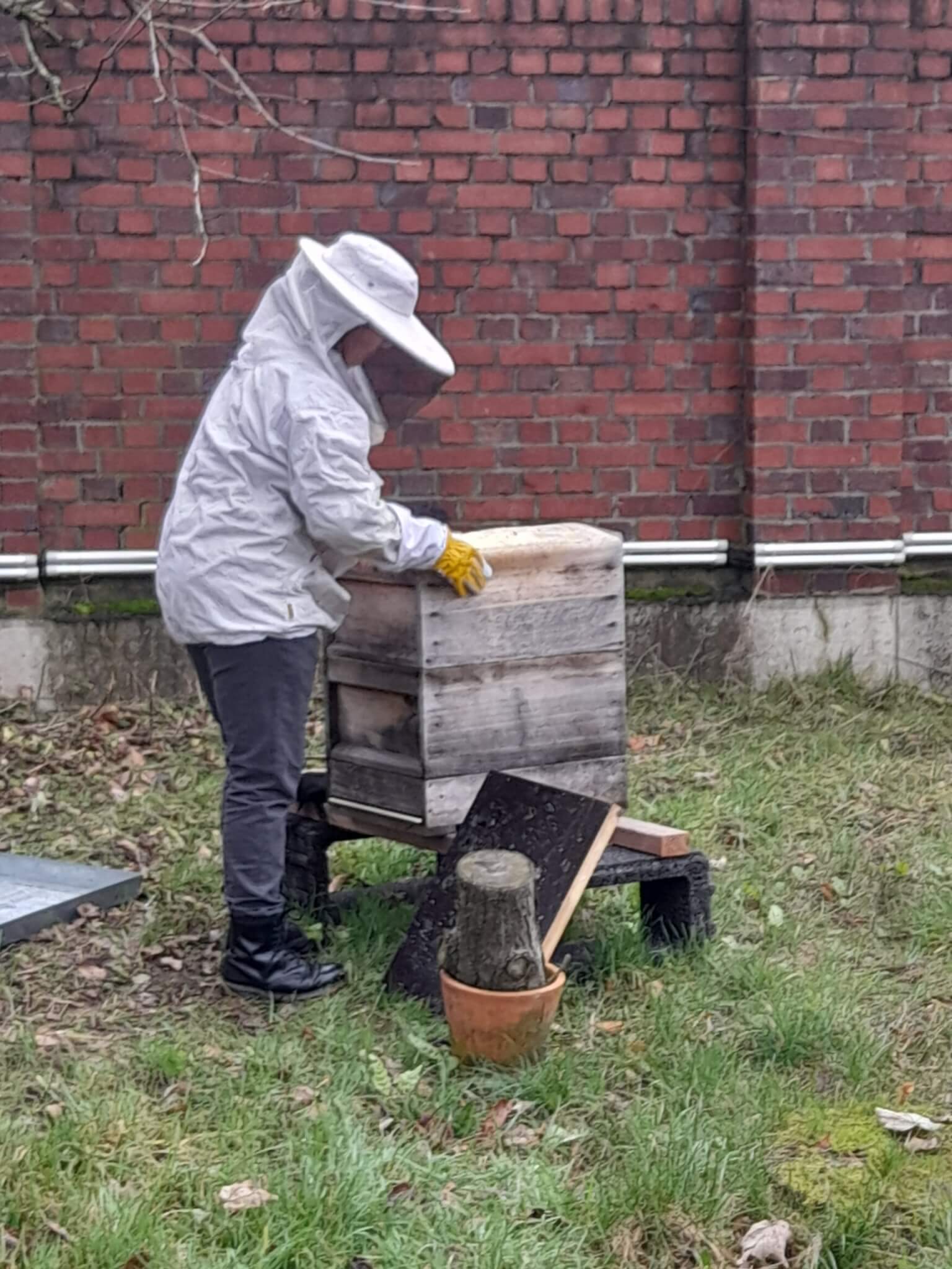 Honigbienen, wie die von unserer Hobby-Imkerin Patricia, überwintern in ihrem Bienenstock. Sie verlassen ihren Stock nicht und halten sich durch Zittern warm. Um über den Winter zu kommen und ihre Brut zu füttern, legen Bienen über den Sommer einen Honigvorrat an. Da wir Menschen diesen aber nutzen, müssen Honigbienen im Winter gefüttert werden. Dies passiert oft mit Zuckerwasser. Zum Füttern war Patricia kürzlich da, weil ihr Bienenvolk bei uns nahe der Wildblumenwiese steht. Seit den wärmeren Temperaturen sind sie sogar schon mal ausgeflogen. Übrigens sind die ersten wichtigen Nahrungsquellen für Wildbienen und Honigbienen und andere Insekten Frühblüher wie Haselnuss, wilde Tulpen, roter Holunder oder Schneeglöckchen.